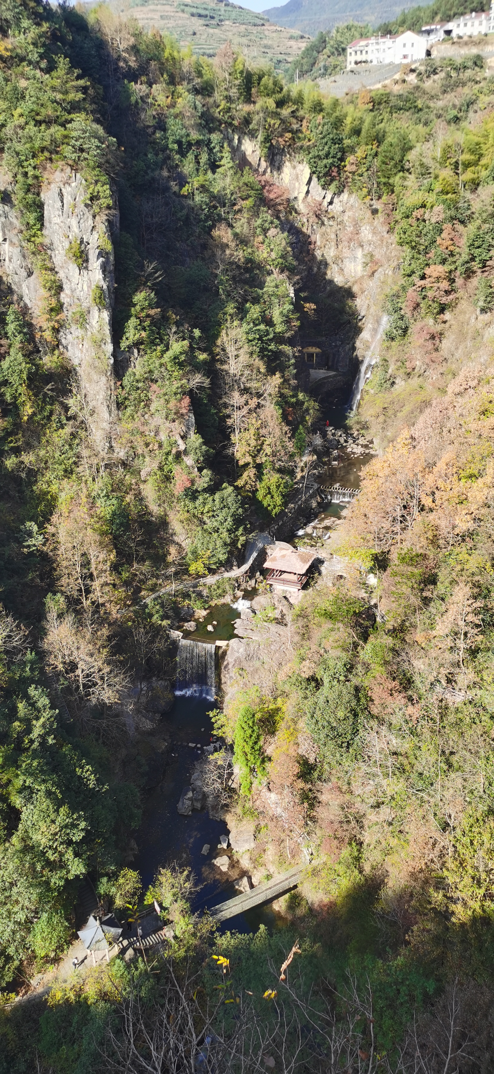 正達(dá)億年火山奇觀,千米平板長溪,坐落在“群山之祖,諸水之源”的大盤山簏。溯花溪尋源而上,眼前廊橋飛掛、小村炊煙、潭瀑相間,清澈的平板長溪優(yōu)雅綿長。